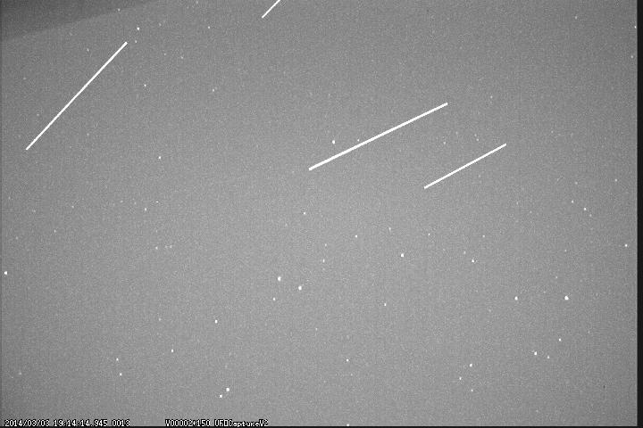 2014年3月3日19:14:14JSに望遠レンズ(f 12mm、視野31×23°)の視野内に4機の人工衛星が写り