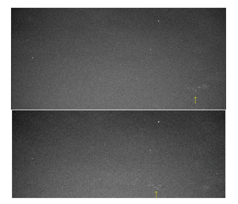 自動流星TV観測で、夜空を撮影しているときに写った渡り鳥。隊列を組んで飛んでいる姿が映っている。 下の画像は2008年11月5日19時16分JSTに写ったもの。