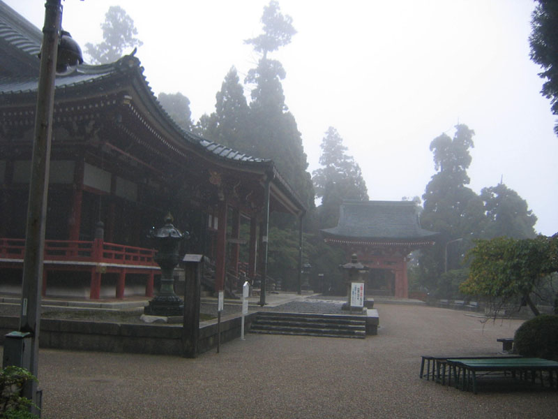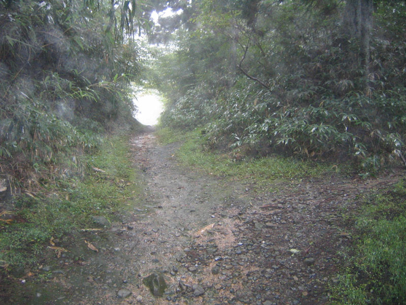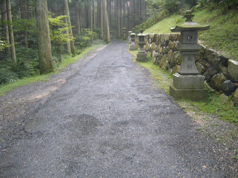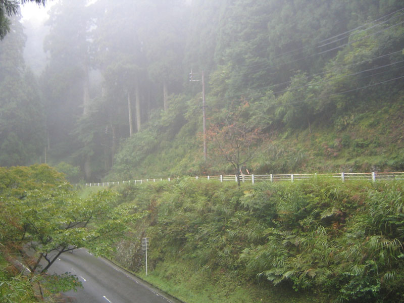 釈迦堂付近の比叡山ドライブウエイ。このあたりが落下予報地点から約500メートルの所です。ここから先は、山道があり、まだ奥へ進めそうであったが、雨と霧のため進むのをあきらめました。ここから予報地点までは杉の木と雑草が生い茂った山深いところで、密林を行く装備が必要で、晴天の日に実行すべきと感じました。