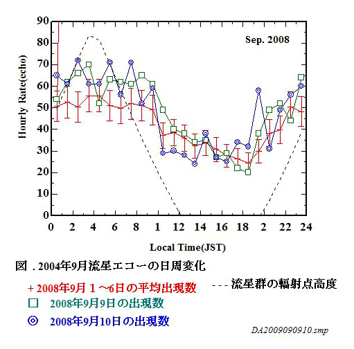 + の出現グラフは2008年9月1〜6日の各時刻の平均出現数で、群活動のなかった日でもあり、その出現数は散在流星の日周変化を表している。